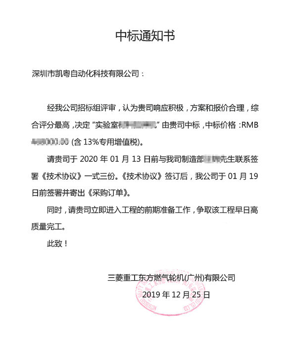 在激烈的竞争中凯粤中标三菱重工东方燃机轮机(广州)有限公司实验室检测设备项目,被三菱重工东方燃机轮机(广州)有限公司选入供应链体系,这是三菱重工东方燃气轮公司对我司产品的认可,我司将不辜负客户的期望,以优质的产品和服务回馈客户。